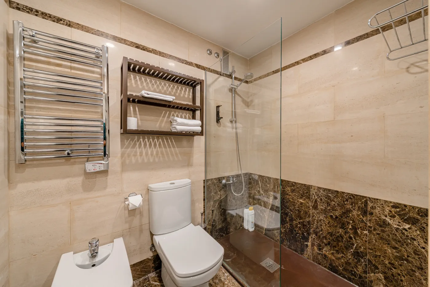 Cuenta con una sala de estar, un dormitorio independiente y un baño con ducha y bidé. La cocina está totalmente equipada con placa de cocina, nevera, lavavajillas y utensilios, ideal para preparar tus comidas durante la estancia.